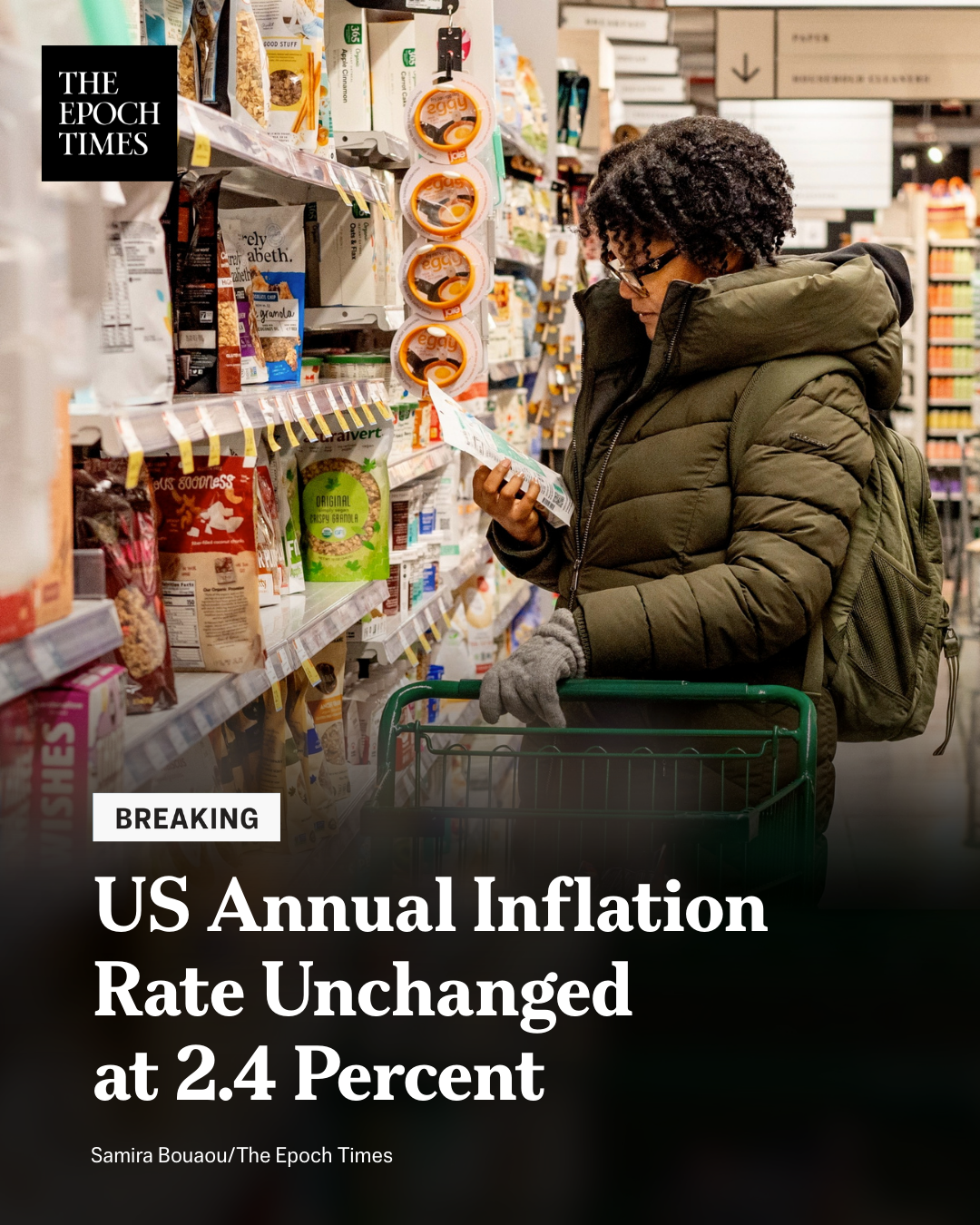 댓글 불러오는 중... - Mar 11, 2026, 01:10 PM[EN] 🚨 𝐁𝐑𝐄𝐀𝐊𝐈𝐍𝐆: 𝐔𝐒 𝐀𝐧𝐧𝐮𝐚𝐥 𝐈𝐧𝐟𝐥𝐚𝐭𝐢𝐨𝐧 𝐑𝐚𝐭𝐞 𝐔𝐧𝐜𝐡𝐚𝐧𝐠𝐞𝐝 𝐚𝐭 𝟐.𝟒 𝐏𝐞𝐫𝐜𝐞𝐧𝐭All eyes will be on next month’s Consumer Price Index (CPI) report due to the Iranian conflict.Read more👇https://theepochtim.es/qpn4ul [KO] 🚨 속보: 미국의 연간 인플레이션율은 2.4%로 변함없습니다. 모든 시선은 이란 분쟁으로 인한 다음 달 소비자 물가 지수(CPI) 보고서에 쏠릴 것입니다.자세히 보기👇 https://theepochtim.es/qpn4ul💬 3🔁 19⭐ 79