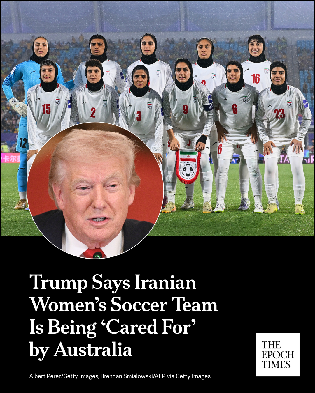 댓글 불러오는 중... - Mar 09, 2026, 09:45 PM[EN] ⚽ 𝐓𝐫𝐮𝐦𝐩 𝐒𝐚𝐲𝐬 𝐈𝐫𝐚𝐧𝐢𝐚𝐧 𝐖𝐨𝐦𝐞𝐧’𝐬 𝐒𝐨𝐜𝐜𝐞𝐫 𝐓𝐞𝐚𝐦 𝐈𝐬 𝐁𝐞𝐢𝐧𝐠 ‘𝐂𝐚𝐫𝐞𝐝 𝐅𝐨𝐫’ 𝐛𝐲 𝐀𝐮𝐬𝐭𝐫𝐚𝐥𝐢𝐚Trump offered asylum to the Iranian team after hearing players were threatened for not singing the Iranian national anthem.Read more👇https://theepochtim.es/pf8lub [KO] ⚽ 트럼프는 이란 여자 축구팀이 호주의 '보호'를 받고 있다고 말했습니다. 트럼프는 선수들이 이란 국가를 부르지 않는다는 이유로 위협을 받았다는 소식을 듣고 이란 팀에 망명을 제안했습니다.자세히 보기👇 https://theepochtim.es/pf8lub💬 9🔁 56⭐ 220