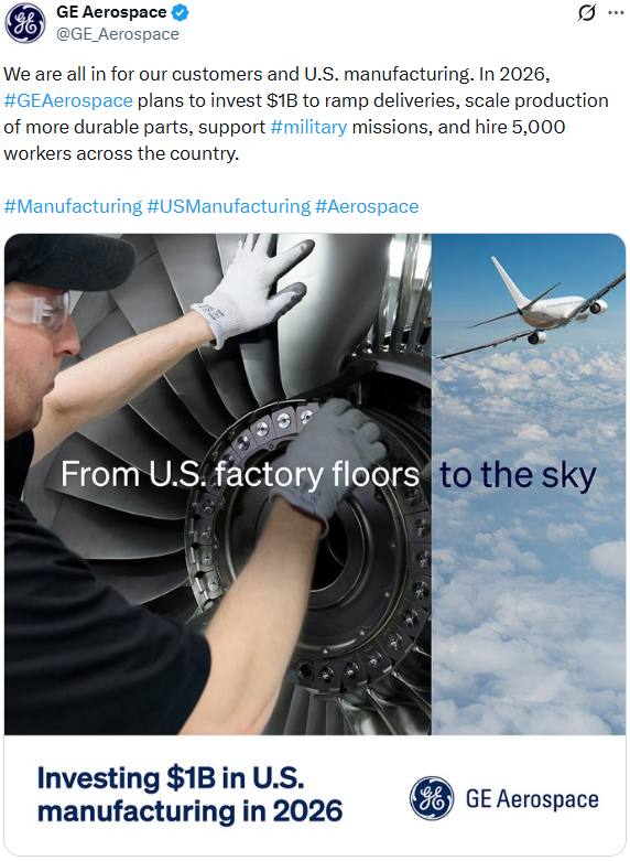 댓글 불러오는 중... - Mar 09, 2026, 04:52 PM[EN] 🚨 NEW: GE Aerospace announces a $1B investment in their domestic manufacturing operations, creating 5,000 American jobs [KO] 🚨 신규: GE Aerospace는 국내 제조 운영에 10억 달러를 투자하여 5,000개의 미국 일자리를 창출한다고 발표했습니다.💬 3🔁 64⭐ 182