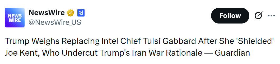 댓글 불러오는 중... - Apr 03, 2026, 12:16 PM[EN] White House Director of Communications Steven Cheung: "President @realDonaldTrump has total confidence in @DNITulsiGabbard, and any insinuation otherwise is totally fake news. The President has assembled the most talented and impactful Cabinet ever, and they have collectively delivered historic victories on behalf of the American people." [KO] 백악관 홍보 담당 이사 Steven Cheung: "@realDonaldTrump 대통령은 @DNITulsiGabbard에 대해 전적인 신뢰를 갖고 있으며 그렇지 않은 모든 암시는 완전히 가짜 뉴스입니다. 대통령은 역대 가장 유능하고 영향력 있는 내각을 구성했으며 그들은 미국 국민을 대신하여 집단적으로 역사적인 승리를 거두었습니다."💬 2🔁 100⭐ 250