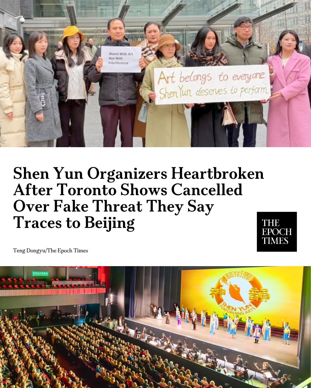 댓글 불러오는 중... - Apr 02, 2026, 06:05 PM[EN] 🚨 𝐒𝐡𝐞𝐧 𝐘𝐮𝐧 𝐎𝐫𝐠𝐚𝐧𝐢𝐳𝐞𝐫𝐬 𝐇𝐞𝐚𝐫𝐭𝐛𝐫𝐨𝐤𝐞𝐧 𝐀𝐟𝐭𝐞𝐫 𝐓𝐨𝐫𝐨𝐧𝐭𝐨 𝐒𝐡𝐨𝐰𝐬 𝐂𝐚𝐧𝐜𝐞𝐥𝐥𝐞𝐝 𝐎𝐯𝐞𝐫 𝐅𝐚𝐤𝐞 𝐓𝐡𝐫𝐞𝐚𝐭 𝐓𝐡𝐞𝐲 𝐒𝐚𝐲 𝐓𝐫𝐚𝐜𝐞𝐬 𝐭𝐨 𝐁𝐞𝐢𝐣𝐢𝐧𝐠Local presenters say venue’s decision to cancel shows is ‘unprecedented.’Read more👇https://theepochtim.es/3tez4q [KO] 🚨 토론토 공연이 가짜 위협으로 취소된 후 상심한 션윈 주최측 현지 발표자들은 공연장의 공연 취소 결정이 '전례 없는' 결정이라고 말했습니다. https://theepochtim.es/3tez4q💬 7🔁 20⭐ 52