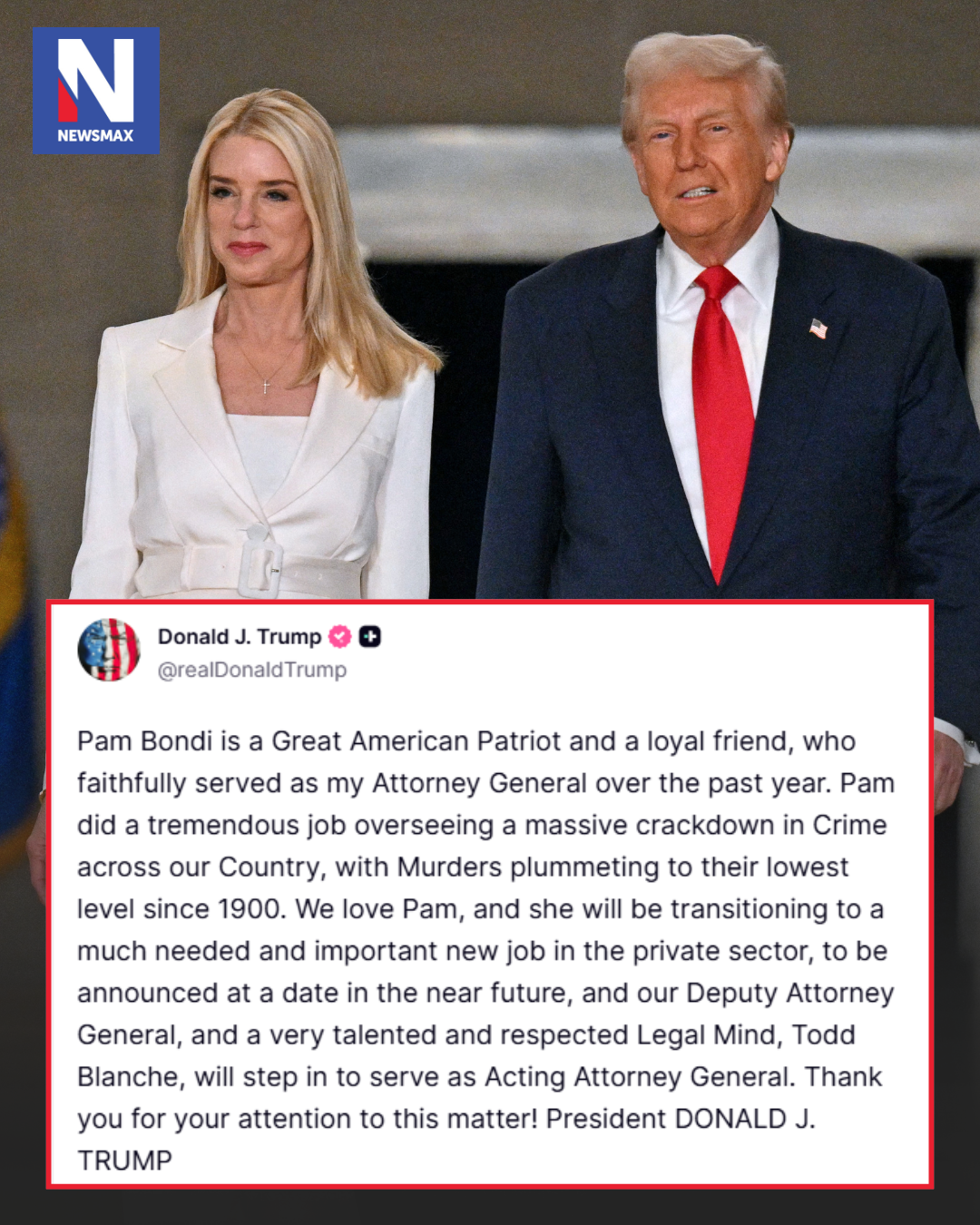 댓글 불러오는 중... - [EN] BREAKING: A source close to President Donald Trump confirms to NEWSMAX’s Ed Henry that Pam Bondi is out as attorney general, citing the president’s growing frustration that she has not moved quickly enough to pursue indictments against Democrats over alleged “lawfare.” MORE: https://bit.ly/4v73XFZ [KO] 속보: 도널드 트럼프 대통령과 가까운 소식통은 NEWSMAX의 에드 헨리에게 팸 본다이가 법무장관직에서 사임했다고 확인했으며, 트럼프 대통령이 "법률" 혐의로 민주당을 기소할 만큼 신속하게 움직이지 않았다는 점에 대한 대통령의 불만이 커지고 있다고 말했습니다. 더: https://bit.ly/4v73XFZ💬 135🔁 125⭐ 633