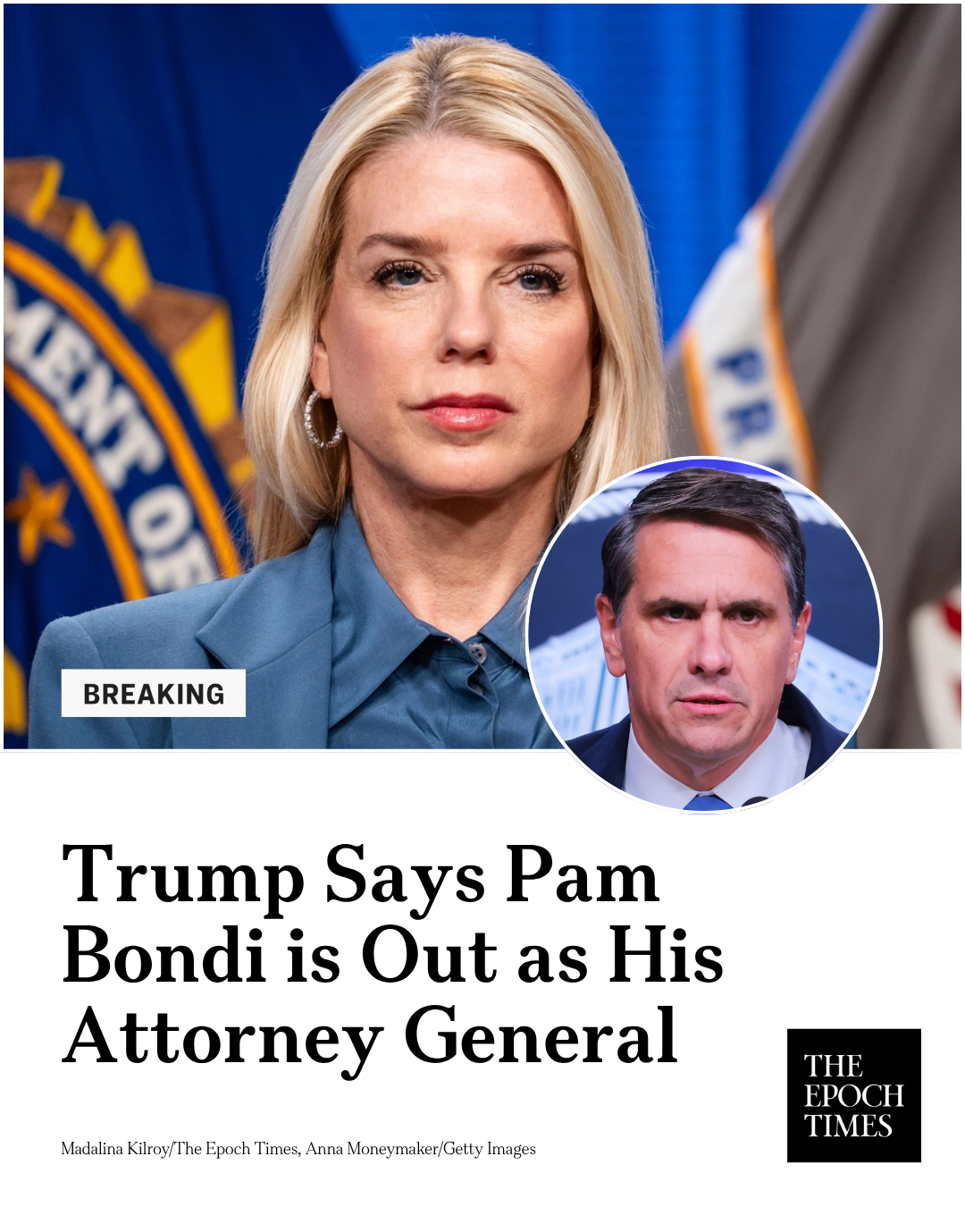 - Apr 02, 2026, 06:43 PM[EN] 🚨 𝐁𝐑𝐄𝐀𝐊𝐈𝐍𝐆: 𝐓𝐫𝐮𝐦𝐩 𝐒𝐚𝐲𝐬 𝐏𝐚𝐦 𝐁𝐨𝐧𝐝𝐢 𝐢𝐬 𝐎𝐮𝐭 𝐚𝐬 𝐇𝐢𝐬 𝐀𝐭𝐭𝐨𝐫𝐧𝐞𝐲 𝐆𝐞𝐧𝐞𝐫𝐚𝐥Bondi will be replaced by her deputy Todd Blanche, who will serve as acting attorney general.Read more👇https://theepochtim.es/xkz34u [KO] 🚨 속보: 트럼프는 법무장관 팸 본다이가 사임한다고 말합니다. 본다이가 법무장관 대행을 맡은 토드 블랑쉬 부장관으로 교체될 것이라고 합니다.자세히 보기👇 https://theepochtim.es/xkz34u💬 30🔁 31⭐ 132