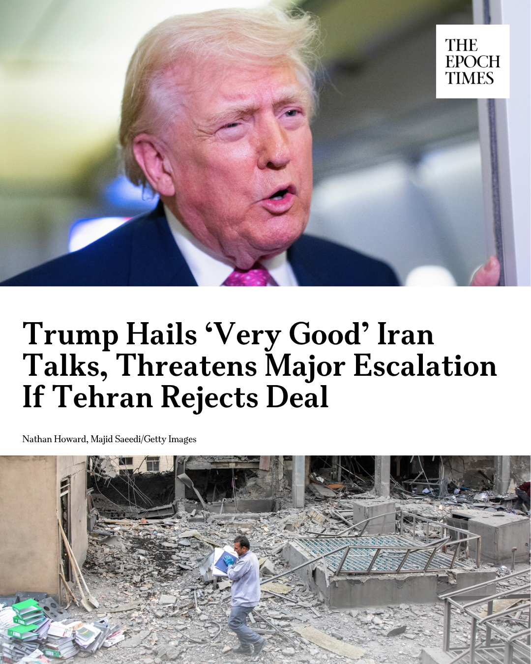 댓글 불러오는 중... - Mar 30, 2026, 09:25 PM[EN] 🚨 𝐓𝐫𝐮𝐦𝐩 𝐇𝐚𝐢𝐥𝐬 ‘𝐕𝐞𝐫𝐲 𝐆𝐨𝐨𝐝’ 𝐈𝐫𝐚𝐧 𝐓𝐚𝐥𝐤𝐬, 𝐓𝐡𝐫𝐞𝐚𝐭𝐞𝐧𝐬 𝐌𝐚𝐣𝐨𝐫 𝐄𝐬𝐜𝐚𝐥𝐚𝐭𝐢𝐨𝐧 𝐈𝐟 𝐓𝐞𝐡𝐫𝐚𝐧 𝐑𝐞𝐣𝐞𝐜𝐭𝐬 𝐃𝐞𝐚𝐥Trump said a new group of ’very reasonable' Iranian negotiators are involved and have accepted most of Washington’s 15-point cease-fire proposal.Read more👇https://theepochtim.es/lwfhy0 [KO] 🚨 트럼프는 '매우 좋은' 이란 회담을 환영하고, 테헤란이 거래를 거부할 경우 대규모 확대를 위협한다고 위협합니다. 트럼프는 새로운 '매우 합리적인' 이란 협상가 그룹이 참여했으며 워싱턴의 15개항 휴전 제안 대부분을 수락했다고 말했습니다. 자세히보기👇 https://theepochtim.es/lwfhy0💬 14🔁 32⭐ 125
