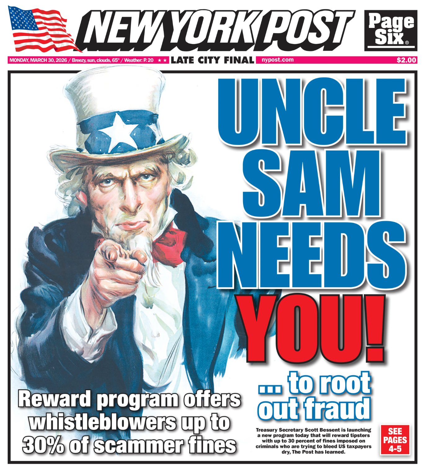 댓글 불러오는 중... - Mar 30, 2026, 12:45 PM[EN] Treasury Secretary Scott Bessent is launching a new program on Monday that will reward tipsters with up to 30% of the fines imposed on criminals who are trying to bleed US taxpayers dry" [KO] 스콧 베센트(Scott Bessent) 재무장관은 월요일 미국 납세자들의 피를 흘리게 하려는 범죄자들에게 부과되는 벌금의 최대 30%를 정보 제공자에게 보상하는 새로운 프로그램을 시작했습니다."💬 16🔁 140⭐ 298