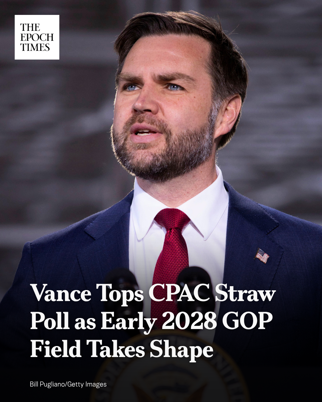 댓글 불러오는 중... - Mar 29, 2026, 04:45 PM[EN] 𝐕𝐚𝐧𝐜𝐞 𝐓𝐨𝐩𝐬 𝐂𝐏𝐀𝐂 𝐒𝐭𝐫𝐚𝐰 𝐏𝐨𝐥𝐥 𝐚𝐬 𝐄𝐚𝐫𝐥𝐲 𝟐𝟎𝟐𝟖 𝐆𝐎𝐏 𝐅𝐢𝐞𝐥𝐝 𝐓𝐚𝐤𝐞𝐬 𝐒𝐡𝐚𝐩𝐞In 2025, Vance won the CPAC straw poll for the 2028 Republican presidential nomination.Read more👇https://theepochtim.es/2pv9o4 [KO] Vance는 2028년 초 공화당 분야의 형태가 구체화되면서 CPAC 밀짚 여론 조사에서 1위를 차지했습니다. 2025년 Vance는 2028년 공화당 대선 후보 지명을 위한 CPAC 밀짚 여론 조사에서 승리했습니다.자세히 보기👇 https://theepochtim.es/2pv9o4💬 19🔁 40⭐ 194