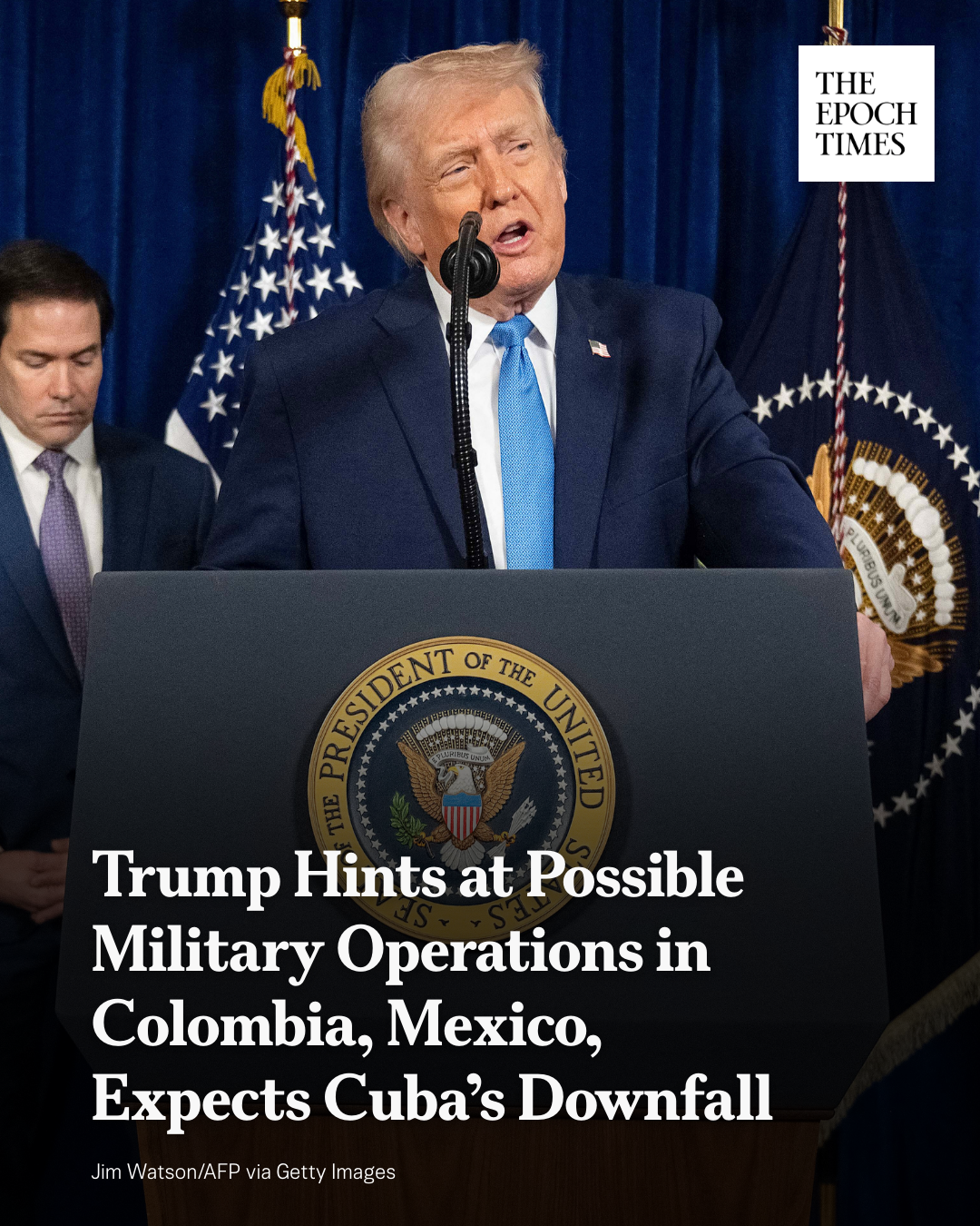 💬 30🔁 51⭐ 172 - @epochtimesJan 05, 2026, 12:00 PM[EN] 🚨 𝐓𝐫𝐮𝐦𝐩 𝐇𝐢𝐧𝐭𝐬 𝐚𝐭 𝐏𝐨𝐬𝐬𝐢𝐛𝐥𝐞 𝐌𝐢𝐥𝐢𝐭𝐚𝐫𝐲 𝐎𝐩𝐞𝐫𝐚𝐭𝐢𝐨𝐧𝐬 𝐢𝐧 𝐂𝐨𝐥𝐨𝐦𝐛𝐢𝐚, 𝐌𝐞𝐱𝐢𝐜𝐨, 𝐄𝐱𝐩𝐞𝐜𝐭𝐬 𝐂𝐮𝐛𝐚’𝐬 𝐃𝐨𝐰𝐧𝐟𝐚𝐥𝐥Colombia, Mexico, and Cuba have strongly denounced U.S. airstrikes on Venezuela.Read more:https://theepochtim.es/xwq6km [KO] 🚨 트럼프는 콜롬비아, 멕시코에서 가능한 군사 작전을 암시하고 쿠바의 몰락을 예상합니다. 콜롬비아, 멕시코, 쿠바는 베네수엘라에 대한 미국의 공습을 강력히 비난했습니다. 더 읽어보기: https://theepochtim.es/xwq6km