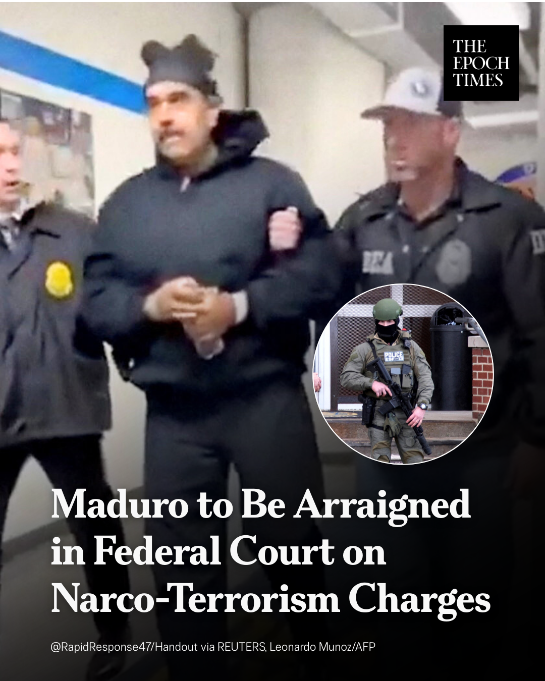 - @epochtimesJan 05, 2026, 01:30 PM[EN] 🚨 𝐌𝐚𝐝𝐮𝐫𝐨 𝐭𝐨 𝐁𝐞 𝐀𝐫𝐫𝐚𝐢𝐠𝐧𝐞𝐝 𝐢𝐧 𝐅𝐞𝐝𝐞𝐫𝐚𝐥 𝐂𝐨𝐮𝐫𝐭 𝐨𝐧 𝐍𝐚𝐫𝐜𝐨-𝐓𝐞𝐫𝐫𝐨𝐫𝐢𝐬𝐦 𝐂𝐡𝐚𝐫𝐠𝐞𝐬The captured Venezuelan leader is set to be arraigned at noon on Monday in a Manhattan federal court before Judge Alvin Hellerstein.Read more:https://theepochtim.es/x3agek [KO] 🚨 마두로는 마약 테러 혐의로 연방 법원에서 기소됩니다 체포된 베네수엘라 지도자는 월요일 정오에 맨해튼 연방 법원에서 앨빈 헬러스타인 판사 앞에서 기소될 예정입니다.자세히 보기: https://theepochtim.es/x3agek