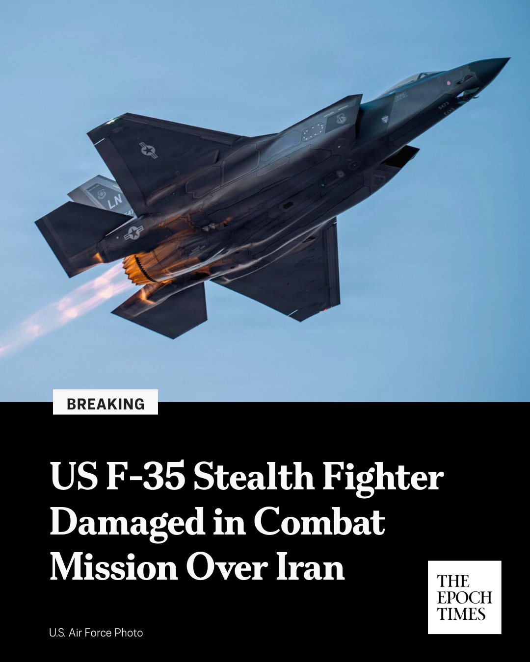 댓글 불러오는 중... - Mar 19, 2026, 04:32 PM[EN] 🚨 𝐁𝐑𝐄𝐀𝐊𝐈𝐍𝐆: 𝐔𝐒 𝐅-𝟑𝟓 𝐒𝐭𝐞𝐚𝐥𝐭𝐡 𝐅𝐢𝐠𝐡𝐭𝐞𝐫 𝐃𝐚𝐦𝐚𝐠𝐞𝐝 𝐢𝐧 𝐂𝐨𝐦𝐛𝐚𝐭 𝐌𝐢𝐬𝐬𝐢𝐨𝐧 𝐎𝐯𝐞𝐫 𝐈𝐫𝐚𝐧A Pentagon spokesperson says the aircraft made an emergency landing. The incident is under investigation.Read more👇https://theepochtim.es/1t7cfi [KO] 🚨 속보: 이란 상공 전투 임무에서 미국 F-35 스텔스 전투기가 손상되었습니다. 미 국방부 대변인은 항공기가 비상 착륙했다고 밝혔습니다. 해당 사건은 조사 중입니다.자세히 보기👇 https://theepochtim.es/1t7cfi💬 8🔁 30⭐ 87