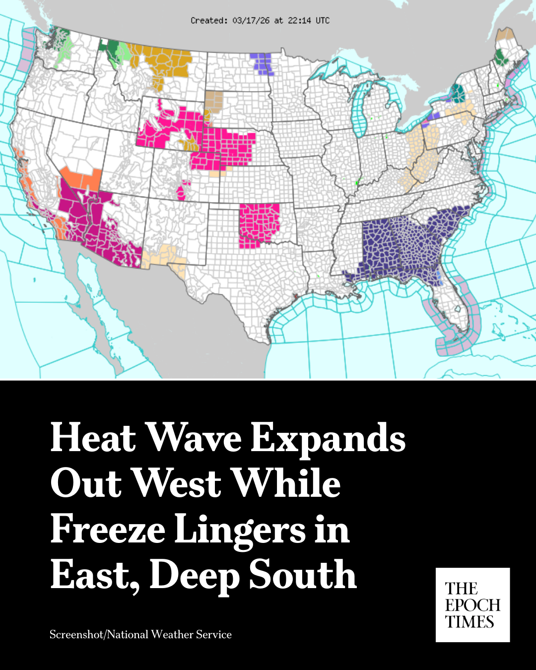 댓글 불러오는 중... - Mar 17, 2026, 11:05 PM[EN] 🌡️ 𝐇𝐞𝐚𝐭 𝐖𝐚𝐯𝐞 𝐄𝐱𝐩𝐚𝐧𝐝𝐬 𝐎𝐮𝐭 𝐖𝐞𝐬𝐭 𝐖𝐡𝐢𝐥𝐞 𝐅𝐫𝐞𝐞𝐳𝐞 𝐋𝐢𝐧𝐠𝐞𝐫𝐬 𝐢𝐧 𝐄𝐚𝐬𝐭, 𝐃𝐞𝐞𝐩 𝐒𝐨𝐮𝐭𝐡The National Weather Service’s Weather Prediction Center said record high and record low temperatures could be recorded across the country this week.Read more👇https://theepochtim.es/231t53 [KO] 🌡️ 폭염이 서쪽으로 확장되고 동부와 남부 깊은 곳에서는 동결이 지속되고 있습니다. 국립기상청 기상예보센터는 이번 주 전국적으로 사상 최고 기온과 최저 기온을 기록할 수 있다고 밝혔습니다.자세히 보기👇 https://theepochtim.es/231t53💬 7🔁 16⭐ 38