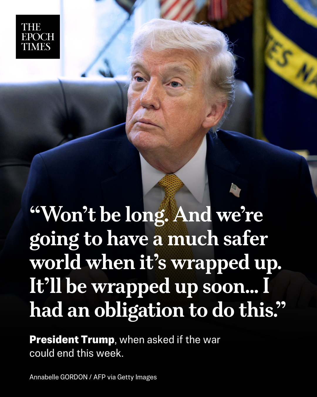 댓글 불러오는 중... - Mar 17, 2026, 02:05 PM[EN] 🇺🇸 𝐓𝐫𝐮𝐦𝐩 𝐄𝐱𝐩𝐞𝐜𝐭𝐬 𝐈𝐫𝐚𝐧 𝐖𝐚𝐫 𝐭𝐨 𝐄𝐧𝐝 ‘𝐒𝐨𝐨𝐧’ During a press conference in the Oval Office, Trump was asked whether he thinks the war could end this week, to which he replied, “I don’t think so, but it’ll be soon.”Read more👇https://theepochtim.es/p2fjhy [KO] 🇺🇸 트럼프, 이란 전쟁 '곧' 끝날 것으로 예상 트럼프 대통령은 백악관 집무실에서 열린 기자회견에서 전쟁이 이번 주에 끝날 수 있다고 생각하느냐는 질문에 "그렇지 않을 것 같지만 곧 끝날 것"이라고 답했습니다. https://theepochtim.es/p2fjhy💬 9🔁 21⭐ 106