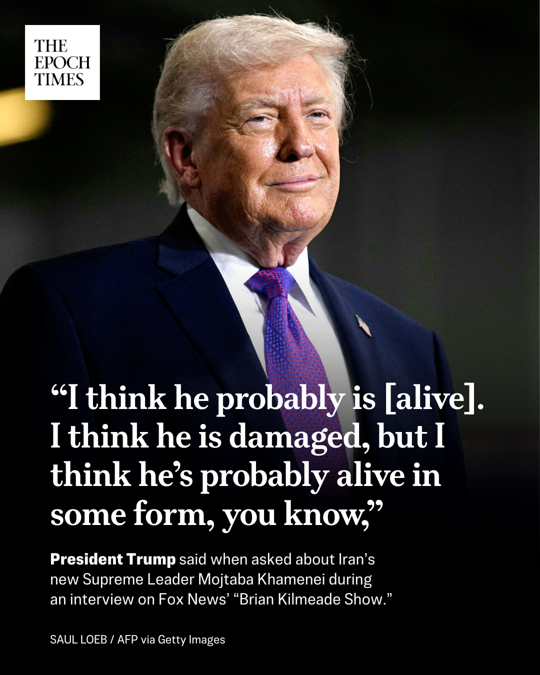 댓글 불러오는 중... - Mar 13, 2026, 06:45 PM[EN] 🚨 ‘𝐈𝐫𝐚𝐧’𝐬 𝐍𝐞𝐰 𝐒𝐮𝐩𝐫𝐞𝐦𝐞 𝐋𝐞𝐚𝐝𝐞𝐫 𝐈𝐬 𝐏𝐫𝐨𝐛𝐚𝐛𝐥𝐲 ‘𝐀𝐥𝐢𝐯𝐞 𝐢𝐧 𝐒𝐨𝐦𝐞 𝐅𝐨𝐫𝐦,’ 𝐓𝐫𝐮𝐦𝐩 𝐒𝐚𝐲𝐬Mojtaba Khamenei made his first statement as Iran’s supreme leader on March 12.Read more👇https://theepochtim.es/cuy13j [KO] 🚨 '이란의 새 최고 지도자는 아마도 '어떤 형태로든 살아 있을 것'일 것입니다'라고 트럼프는 3월 12일 이란의 최고 지도자로서 모즈타바 하메네이가 첫 성명을 발표했습니다.자세히 보기👇 https://theepochtim.es/cuy13j💬 12🔁 31⭐ 92