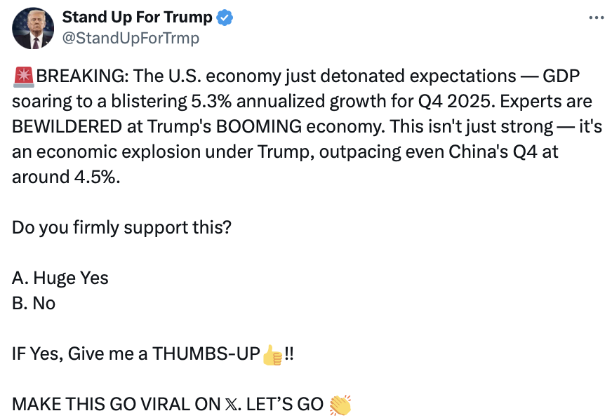 - @realDonaldTrumpFeb 06, 2026, 04:49 AM💬 203🔁 1822⭐ 7519