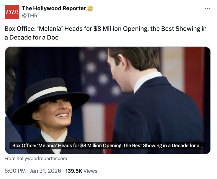 - @realDonaldTrumpFeb 01, 2026, 04:26 PM[EN] https://www.hollywoodreporter.com/movies/movie-news/box-office-melania-opening-weekend-1236490092/ [KO] https://www.hollywoodreporter.com/movies/movie-news/box-office-melania-opening-weekend-1236490092/💬 438🔁 2613⭐ 12165